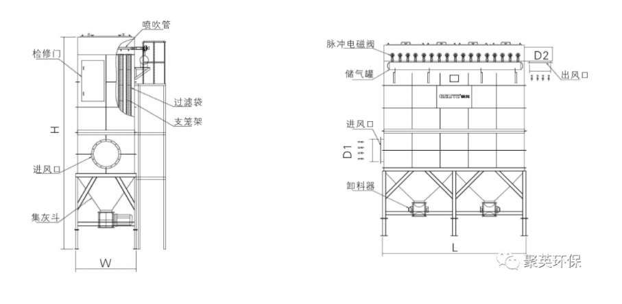 含塵氣體進(jìn)入脈沖袋式除塵器,氣流流經(jīng)灰斗,流速放慢,慣性作用使粗顆粒粉塵直接落入灰斗。起預(yù)收塵的作用,氣流隨后通過內(nèi)部裝有金屬骨架的濾袋,粉塵被捕集在濾袋表面,凈化后氣體匯集到出風(fēng)口排出,除塵器運(yùn)行過程中,積附在濾袋上的粉塵越來越多,濾袋阻力增加,處理風(fēng)量逐漸減少,為正常工作,需對濾袋進(jìn)行清灰,由脈沖控制程序控制脈沖閥開啟,壓縮空氣由噴吹管各孔經(jīng)文氏管噴射到濾袋內(nèi),濾袋瞬間急劇膨脹,使積附在濾袋表面的粉塵脫落。清下粉塵落入灰斗,經(jīng)排灰系統(tǒng)排出機(jī)體。由此使積附在濾袋上的粉塵周期地脈沖噴吹清灰,使脈沖布袋除塵器始終保持高效運(yùn)行狀態(tài)。