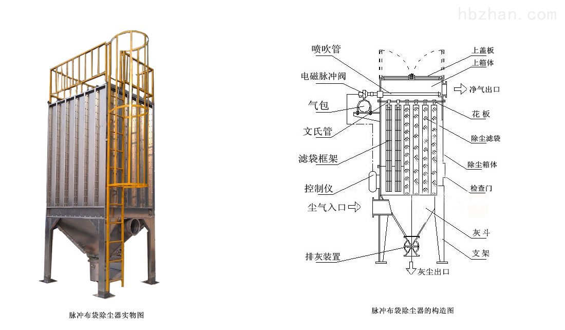 含塵氣體從下開(kāi)式法蘭進(jìn)入過(guò)濾室,粗顆粒直接落入灰倉(cāng),含塵氣體經(jīng)濾袋過(guò)濾,粉塵停留在布袋表面。潔凈氣體通過(guò)袋口進(jìn)入潔凈氣室,由風(fēng)機(jī)排入大氣。當(dāng)濾袋表面灰塵不斷增加時(shí),程控儀表開(kāi)始工作。逐個(gè)打開(kāi)脈沖閥,使壓縮空氣通過(guò)噴嘴噴出,清洗濾袋,使濾袋突然膨脹。在反向氣流的作用下,布袋表面的粉塵迅速?gòu)臑V袋中分離出來(lái),落入灰倉(cāng),由排灰閥排出。