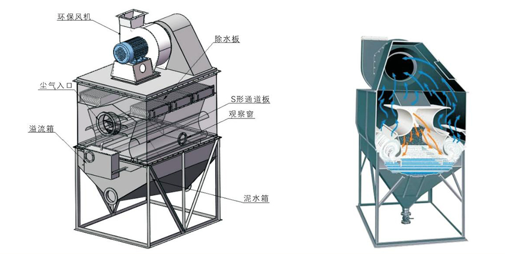 本設備主要由凈化箱、泥水箱、風機底蓋、擋水板、“S” 形板、自動補水箱、排污閥及風機等部分組成。含塵氣體由進風口進入凈化室,氣流轉彎向下沖擊于水面,部分較大的塵粒落入水中。當含塵氣體以18~35m/s的速度通過上、下葉片間的“S"形通道時,激起大量的水花形成一道水簾,使水、氣充分接觸,絕大部分微細粉融入水中,使含塵氣體得以充分凈化。凈化后的氣體經檔水板去除水霧后經風機排出。灰塵所形成的污泥沉積在除塵器底部,定期清除。箱內的水不斷循環(huán)使用,蒸發(fā)損耗的水由自動補水箱內的浮球閥進行補充,保持水位的恒定。
