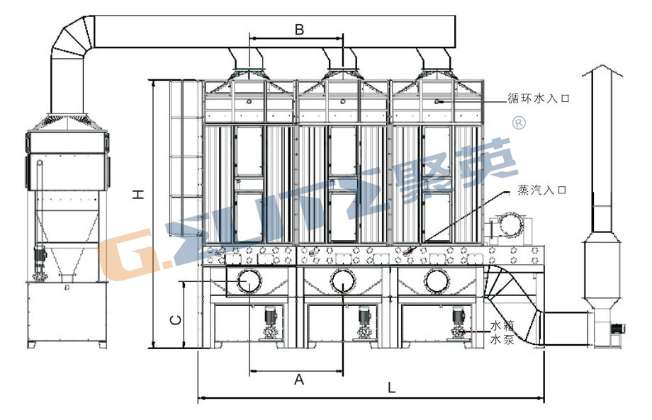 在環(huán)保離心風機的抽吸作用下油煙塵空氣從塵源經(jīng)管道進入濕電油煙塵凈化器,油煙塵顆粒進入高壓電離區(qū)域,通過高頻電源放電對油煙塵顆粒進行電離分解,超細微粒煙塵被高壓擊穿形成正負離子,然后流經(jīng)靜電電場被靜電吸附捕捉,達到凈化的目的。